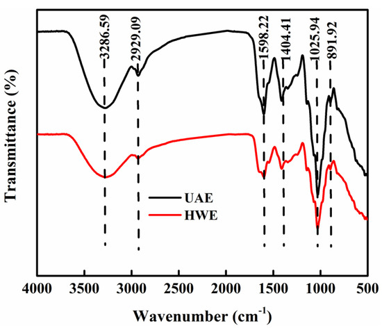 The FT-IR profiles of the HWE and UAE (Figure 3) comprised a characteristic polysaccharide absorption peak in the 400–4000 cm−1 range. The strong and broad absorption peak observed at 3278.73 cm−1 was related to the tensile vibrations of the hydroxyl (–OH) group [30], which forms hydrogen bonds [31]. The weak absorption peak observed at 2929.08 cm−1 was due to the tensile vibrations of the hydrocarbon group (C–H) [32]. The characteristic peaks at 1599.77 and 1411.31 cm−1 correlated with the vibration of the carboxylic acid (–COO) group [33], indicating the presence of glucuronic acid in the FG samples. The region between 800 and 1200 cm−1 is the fingerprint region, and if there was a difference in the structure of the compounds, their absorption peaks in the fingerprint region would have to be different [34]. The series of peaks in the 1000–1200 cm−1 region was confirmed to be typical of polysaccharides [35]. The peak at 1148.70 cm−1 indicated the presence of C–OC–C and C–OH glycosidic bonds, whereas the peak at 1028.92 cm−1 indicated the presence of glucan units or was related to the tensile vibrations of the pyranose ring. The weak absorption band at 895.02 cm−1 was related to the bending vibrations of the C–H bond and indicated the presence of a β-configuration in the FG structure. In conclusion, the FT-IR spectra of the FG samples contained typical polysaccharide-related absorption peaks and confirmed that the UAE-FG retained the polysaccharide structure of the FG.