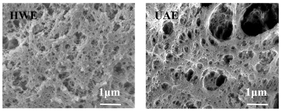 The surface morphologies of the FG samples were studied using SEM (Figure 4). Previously, the HWE presented a dense honeycomb structure. After the ultrasonic treatment, the surface morphology of the UAE underwent obvious changes, and the tissue structure changed. The structure became loose and holes of various sizes appeared. This difference in microstructures was because of the cavitation effect of the ultrasound waves, which disrupted the intermolecular bonds of the FG and reorganized its intermolecular network structure.