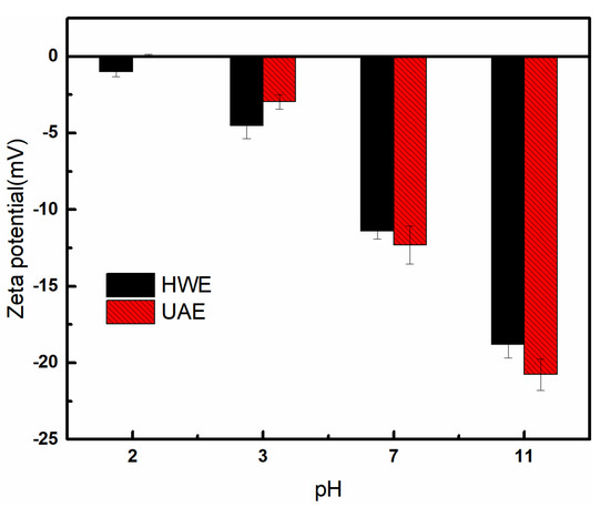 When the zeta potential is high, the dispersed particles have a higher tendency to repel each other. This prevents them from coming close to each other and forming aggregates. The changes in the zeta potential of FG in the 2.0–11.0 pH range are shown in Figure 5. At pH = 2.0, the zeta potential of the HWE sample was −1.00 mV, and that of the UAE was 0.04 mV. Both values were close to zero, indicating that the surface charge of the FG was remarkably close to zero, which was consistent with the results reported by Vieira [37]. When the pH value ranged from 3.0 to 11.0, the potential of the FG was negative. However, the absolute value increased with the increasing pH value. The isoelectric point of the isolated flaxseed protein was at pH 4.2 [38]. However, it was not observed in this study, owing to the low protein content of the extracted FG samples. When the pH was increased from 2.0 to 6.0, the absolute value of the potential of the HWE sample was higher than that of the UAE, and when the pH was between 6.0 and 11.0, the absolute value of the potential of the HWE sample decreased. The extraction of FG mainly occurred in a neutral environment (pH of approximately 7.0), and the zeta potential of the HWE sample was less than that of the UAE. The reason for this may have been the difference in the monosaccharide compositions of the two FG samples.