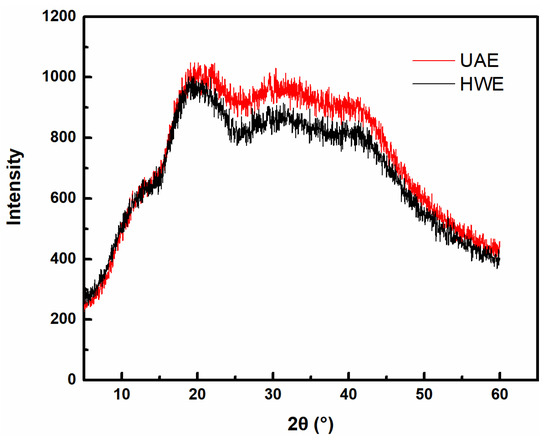 An XRD analysis was performed to evaluate the structures of the FG samples without crystallization regions. In the carbohydrate-based FG, an abundance of OH groups led to the formation of intra- and intermolecular hydrogen bonds, which, in turn, led to varying degrees of junction coherence and an amorphous transformation. The XRD profiles of the HWE and UAE samples are shown in Figure 6. The HWE sample exhibited a broad peak at 2θ = 19.2°, which was attributable to electrostatic interactions and indicated that the sample was noncrystalline. This result was consistent with the findings of Devi et al. [39], who observed that flaxseed mucus was a typical amorphous substance that exhibited a broad and low-intensity XRD peak, which indicated a lack of crystallinity or an ordered structure. The UAE sample exhibited a similar XRD pattern; however, its peak was observed at a relatively higher 2θ value, and the peak area was smaller, indicating a change in the crystal structure of the UAE and, hence, its XRD pattern. This may have been related to the low molecular weight of this sample. The amorphous nature of the polysaccharides resulted in a high kinetic solubility and a high dissolution rate.