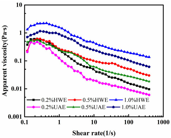 The static rheological curves of the HWE and UAE are shown in Figure 7. The shear rate gradually increased from 0.1 to approximately 400 s−1. As the sample concentration increased, its apparent viscosity increased. This may have been due to the entanglement and aggregation of the molecular chains at higher concentrations [40]. Moreover, the viscosity of the FG solution decreased with an increasing shear rate for all three concentrations, indicating a non-Newtonian fluid. This result was consistent with the results reported by Wang [41]. The results showed that the apparent viscosity of the UAE was low, which may have been because the ultrasound-assisted extraction destroyed the association between the molecular chains, increased the relative movement of the molecular chains, and reduced the viscosity of the solution.