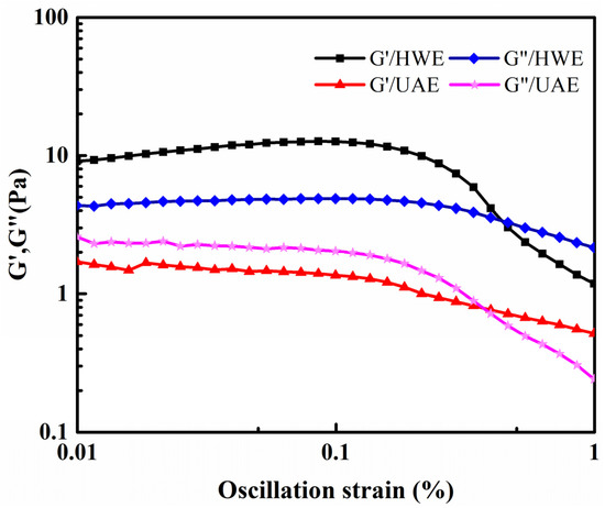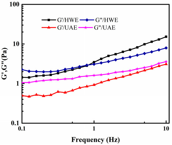 To investigate the dynamic rheological properties of the HWE and UAE samples, solutions with a concentration of 0.5% (w/v) were used. To determine the linear viscoelastic region, the first sweep of the solution was performed at a fixed frequency of 1 Hz (Figure 8). The samples were measured immediately without preshearing. The G′ and G″ values remained essentially constant when the strain was less than 0.1% and within the linear region. For frequency scanning, a strain of 0.1% was used.