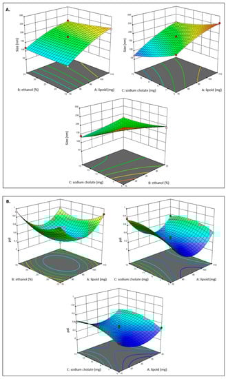 The possible reasons for the influence of each independent factor on particle size include the following. At high ethanol concentrations and above specific levels, the partial solubilization of the lipid bilayers may cause the vesicular bilayers of TEs to become permeable, resulting in a considerable fall in EE% and particle size. A further rise in its concentration would result in the dissolution of vesicles. It was discovered that low ethanol concentrations increased the size of vesicles. This may be due to the vesicular bilayers having been partly solubilized (i.e., sublysis stage). At higher ethanol concentrations, the vesicles may be completely solubilized, and the TEs may no longer exist []. In contrast, higher concentrations of sodium cholate lead to better emulsification and solubilization, which lead to a reduction in the size of the vesicles []. A thicker matrix structure was formed and stiffened the vesicles when the concentration of phospholipids (PL) was raised, which presumably explains why the vesicles expanded in size. Comparable findings were also reported by Nasr et al. []. The drop in vesical size with increasing surfactant concentration may be attributable to the membrane’s greater elasticity and softness, which in turn enhances its reduction capacity. The findings we obtained were in agreement with those of Zaki et al. [].