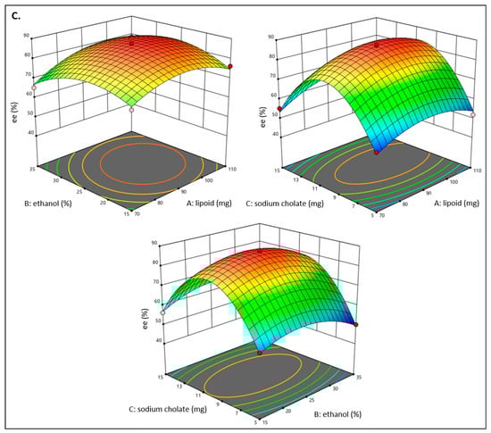 Entrapment efficiency (Y3) = +87.00 + 3.03 A − 0.8588 B + 2.75 C + 2.06 AB + 1.72 AC + 1.77 BC − 6.87 A2 − 7.25 B2 − 24.75 C2