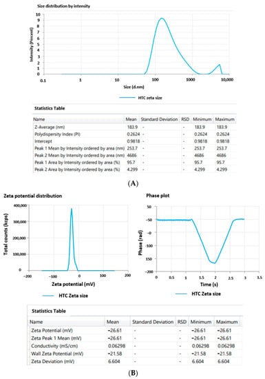 (A) Average particle size distribution; (B) average zeta potential.