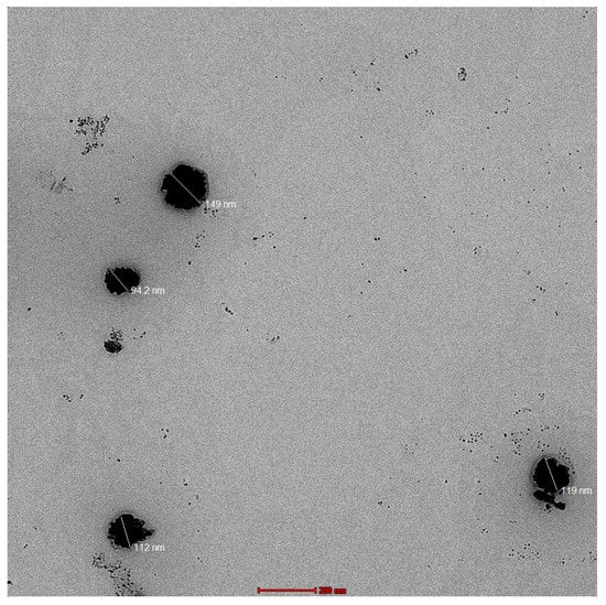 Transmission electron microscopy (TEM) analysis of the optimized HTC-TES formulation at 28,000× demonstrated that the produced vesicles are well-identified sealed structures that are both spherical and of a constant size range (Figure 3). HTC was entirely entrapped in the vesicular structure, as evidenced by the TEM microscope image, which exhibited no crystallinity.