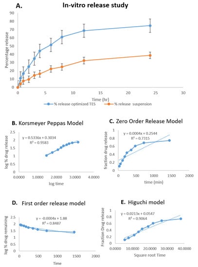 (A) Comparative in vitro release profiles and in vitro release kinetics graphs of HTC-TES at pH 7.4. (B) Korsmeyer–Peppas model. (C) first-order model. (D) zero-order model. (E) Higuchi model.