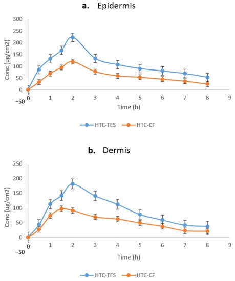 HTC concentration on (a) epidermis and (b) dermis after topical application of HTC-TES gel and HTC-CF gel on excised rat skin.