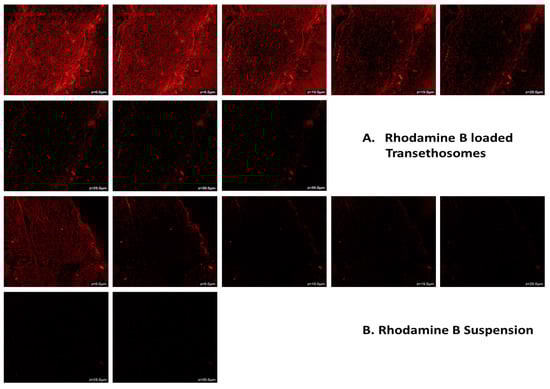CLSM images of rat skin treated with (A) rhodamine B-loaded transethosomes and (B) rhodamine B-loaded hydroalcoholic suspension.