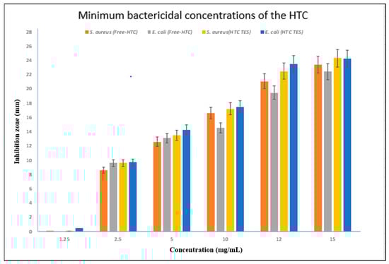 The MBC is found where the inhibition zone corresponds to the MIC for the most resistant strain of bacteria. The minimum bactericidal concentration (MBC) of free HTC was determined to be 5 mg/mL against S. aureus and E. coli, while the MBC of HTC-loaded TES was also 5 mg/mL.