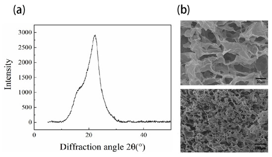 Initially, the cellulose was characterized using XRD and FTIR. XRD results in Figure 1a demonstrated that a strong peak at 2θ of 22.3° and a shoulder at 2θ of 15.8° associated with a crystalline peak at (2 0 0) and (1 1 0), respectively [19]. FTIR results (Figure S1) showed peaks at 3353 and 2905 cm−1 assigned to OH stretching, symmetrical and asymmetric stretching vibrations of CH, peaks at 1429 and 1370 cm−1 associated with CH2 bending and CH bending, peaks at 1318, 1040, and 895 cm−1 assigned to CH2 wagging, COH deformations and antisymmetric out-of-phase ring stretching, all corresponding to the vibration of cellulose-related chemical bonds [20,21]. The absence of a peak at 1726 cm−1 indicated no acetyl and aromatic ester groups of hemicellulose [22].