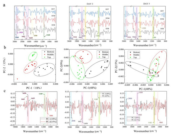 The biological compositions of cells at different depths were further investigated in detail. On day 1, the cells at the bottom zone showed a significant difference from the top zone along PC2 (Figure 3b), interpreted by the strong loading ascribed to protein glycosylation (Figure 3c) [24] and secondary structure of the protein (Figure 3c and Figure S5). However, this PC only accounted for 15% of the variances, suggesting that the difference between the cells at deep, middle, and surface zones was not significant. On day 3, the difference between the top and middle zone disappeared while the cells at the bottom zone still exhibited a distinct separation from the cells at the top zone along PC1 (48%), implicating that the difference in biological compositions associating with 2950, 1662, 1650 cm−1, and 1162 cm−1 (Figure 3b,c and Figure S5) was noticeable. Similar phenomena were observed for the cells on day 5. Some cells at the bottom zone obviously separated from the other cells along PC1 (40%) (Figure 3b), exhibiting the difference in the protein secondary structure and protein glycosylation, which could influence various biological phenomena [25,26].