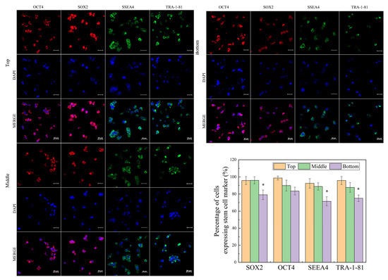 We further examined the pluripotency of hiPSCs. Immunohistochemical analysis (Figure 4) indicated that hiPSCs at the top zone were strongly positive against stem cell markers expressed in non-differentiated ES cells (OCT4, SOX2, SSEA-4, and TRA-1–81) [17], whereas some cells at the bottom zone did not maintain undifferentiated status at the end of culture (Figure 4), which is consistent with results in Figure 3. This difference in pluripotency probably resulted from the low concentration of FGF2 and TGF-β1 at the bottom zone, which is lower than the concentration threshold for maintaining the cell pluripotency [27,28].