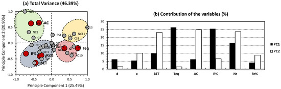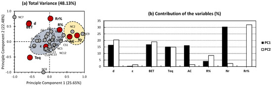Figure 2 shows the PCA results of the investigated aerogels, with the exception of NC7 and NC8. The first two PCs showed 46.39% of the total variance (25.49% for PC1 and 20.90% for PC2; Figure 2a). Even though a slightly lower representativeness was obtained in this case, if compared to the all-dataset approach (Figure 1a), fewer aerogel samples were projected near the node of the first two PCs (Figure 2a). In addition, a relatively higher dispatchment was obtained between the investigated aerogels, as four clusters were identified. These findings prove the effectiveness of the adopted approach, as it removed the bias yielded from the overly loaded factors in the case of the inclusion of NC7 and NC8. For the variables, the time to reach equilibrium and Removal Efficiency (R%) presented the highest contributions along PC1, accounting for 26.25%, and 25.42%, respectively (Figure 2b). Number of reuse/regeneration exhibited a relatively lower contribution, accounting for 16.46% (Figure 2b). This indicates the high influence of time to reach equilibrium (as a “Physical property”) on the Removal Efficiency (R%) (as an “adsorption property”). As for PC2, the highest contributions were yielded for BET surface area, adsorption capacity, and Number of reuse/regeneration (23.13%, 24.86%, and 23.58%, respectively; Figure 2b). This indicates the high influence of BET surface area (as a “Physical property”) on the adsorption capacity, and Number of reuse/regeneration (Nr) (as an “adsorption property”). In order to confirm a negative or positive influence, a closer look-up on the PCA bi-plot should be taken into consideration (Figure 2a). Following the trends of the different variables along the first two PCs, time to reach equilibrium and removal efficiency (R%) were plotted on opposite sides, as the first is found to be on the negative part of PC1, and the second is found on its positive part. These findings make sense, as the lower the time to reach equilibrium is, the more thermodynamically favorable the interaction between the aerogel and the pollutant to be treated will be; therefore, the more favorable the side of the reaction towards removing the pollutant will be.