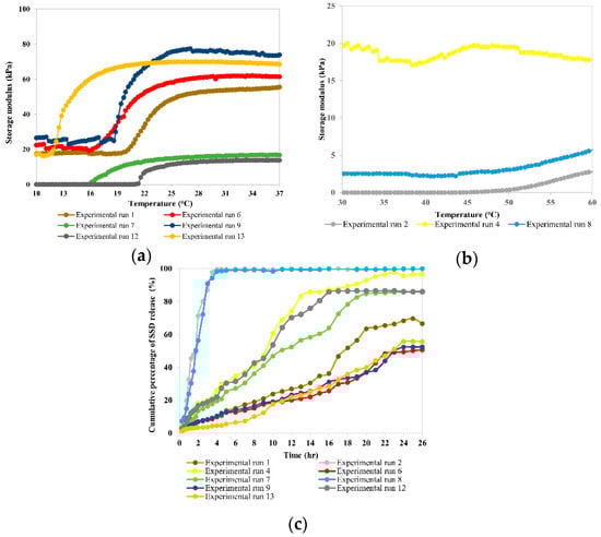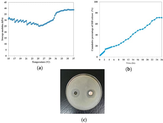 Storage modulus (G′) of temperature-responsive hydrogels at temperature (a) 10–37 °C and (b) 30–60 °C. (c) Cumulative percentage of SSD release from temperature-responsive hydrogels.