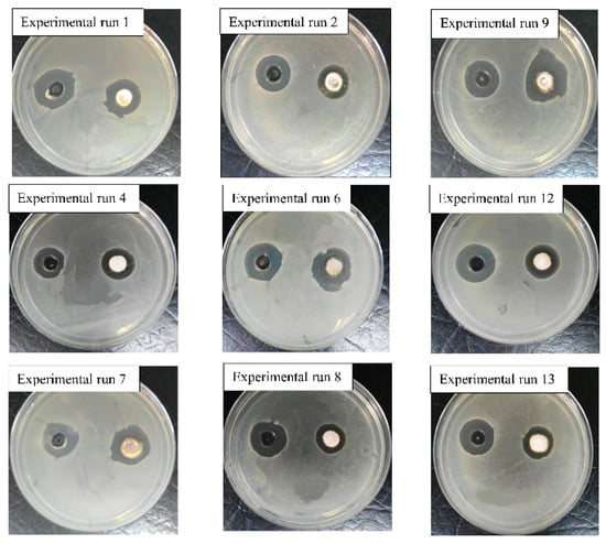 The G′ of temperature-responsive hydrogels as a function of temperature, and the cumulative percentage of SSD release from temperature-responsive hydrogels, are illustrated in Figure 1. Figure 2 shows photographs of the inhibition zone on SSD-loaded temperature-responsive hydrogels against S. aureus. The CCD and responses for the temperature-responsive hydrogel formulations are summarised in Table 1. The LCST values recorded in Table 1 refer to the onset of a G′ increment as a function of temperature [] shown in Figure 1. The LCST of experimental runs 2, 8, and 4, with PF127 percentage ≤15.00 w/v%, was not detected in the temperature range 10–37 °C, as shown in Figure 1a. Consequently, G′ was measured at an extended temperature range between 30–60 °C, as shown in Figure 1b. The G′ values recorded in Table 1 refer to the G′ obtained at 37 °C, while the t50% values refer to the half-life of SSD release obtained from Figure 1c. As shown in Table 1, the LCST was attained in experiment run 8 at 1.50 w/v% biocellulose and 10.86 w/v% PF127. On the other hand, the lowest LCST was attained in experiment run 13 at 1.50 w/v% biocellulose and 39.14 w/v% PF127. PF127 has a higher impact on the LCST of the temperature-responsive hydrogel as PF127 is a temperature-responsive polymer. At a high percentage of PF127, more PF127 micelles in the same volume and hydrogen bonds occur, promoting the formation of a solid-like hydrogel at low temperature []. This explains the decrease in LCST with increase in the PF127 percentage at a constant biocellulose percentage.