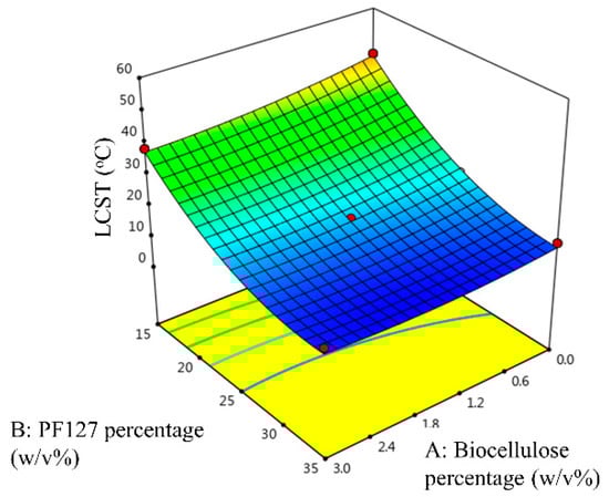 Three-dimensional response surface of LCST as a function of biocellulose percentage and PF127 percentage.