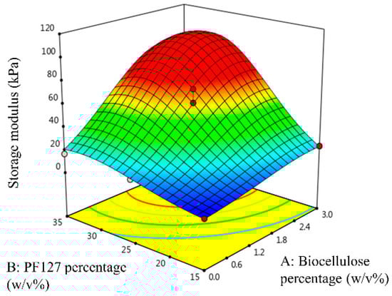 Three-dimensional response surface of G′ as a function of biocellulose percentage and PF127 percentage.