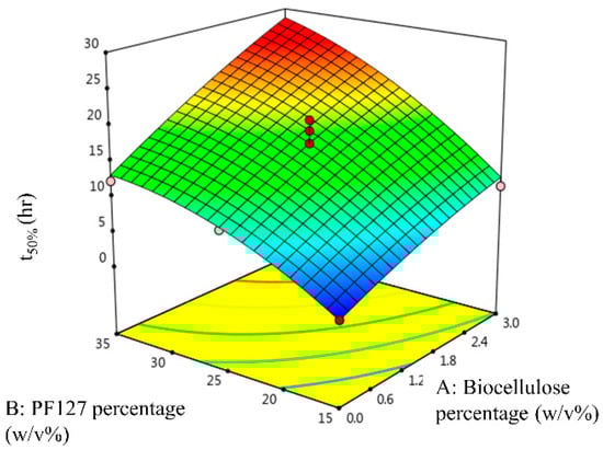 Three-dimensional response surface of t50% as a function of biocellulose percentage and PF127 percentage.