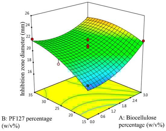Figure 6 shows the three-dimensional response surface of the inhibition zone diameter against S. aureus as a function of the biocellulose percentage and the PF127 percentage. As shown in Figure 6, a high inhibition zone diameter against S. aureus was attained at a high biocellulose percentage and a high PF127 percentage. The inhibition zone diameter against S. aureus increased with increase in the PF127 percentage in the temperature-responsive hydrogel. On the other hand, the inhibition zone diameter against S. aureus was also increased with increase in the biocellulose percentage in the temperature-responsive hydrogel. A confirmation of this postulation is provided by the three-dimensional response surface of the inhibition zone diameter against S. aureus depicted in Figure 6. This can be explained by sustained release of the SSD drug from the temperature-responsive hydrogel at high biocellulose content. Sustained SSD drug release improves the inhibitory potential of the drug against bacterial strains by maintaining constant and localized release of the drug [,].