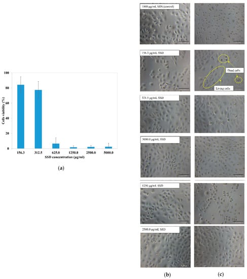 Figure 8a shows the HaCaT cell viability after treatment with temperature-responsive hydrogel loaded at different SSD concentrations. As represented by Figure 8a, the viability of HaCaT cells decreased with increasing SSD drug concentration. This was probably due to cytotoxicity of the SSD drug against the HaCaT cells at high concentration [,]. According to the ISO 10993-5 standard, when the cell viability is more than 70%, this means no cytotoxic potential of the testing material. As presented in Figure 8a, the cell viability at 312.5 μg/mL SSD was recorded as 77.34 ± 11.3% (cell death 22.66%), whereas the cell viability drastically dropped at higher SSD concentration. This indicates that the SSD-loaded temperature-responsive hydrogel formulation with SSD concentration of 312.5 μg/mL and less could be classified as non-cytotoxic. Commercial SSD cream consists of 1 w/w% SSD drug. According to pharmacokinetics study and absorption of the commercial 1 w/w% SSD cream, the serum sulfadiazine concentration is proportional to the amount of cream applied, as well as to the extent of the burned area. The maximum serum sulfadiazine level was recorded at 80 to 120 μg/mL []. This was supported by a study conducted by MI et al. (1985) which found that the maximum sulfadiazine concentration of a severely burned patient receiving 1 w/w% commercial SSD cream was 91 μg/mL after 24 h of treatment []. The maximum sulfadiazine concentration in body serum (80 to 120 μg/mL) was less than the cytotoxic limit of SSD-temperature-responsive hydrogel (>312.5 μg/mL) on HaCaT cells. This confirms the safe use of the SSD-loaded temperature-responsive hydrogel on human skin.