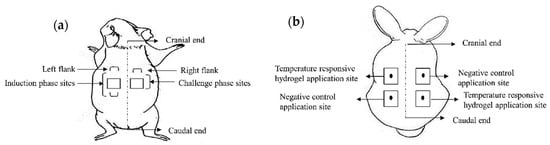 An 8 cm2 patch was first soaked in the temperature-responsive hydrogel and applied onto the upper left flank on the back of each guinea pig to cover the induction phase sites (Figure 9a). The patch was secured with an occlusive dressing. On the other hand, negative controls were treated with normal saline. The patches were removed after 6 h. The test was repeated three days a week for three weeks.
