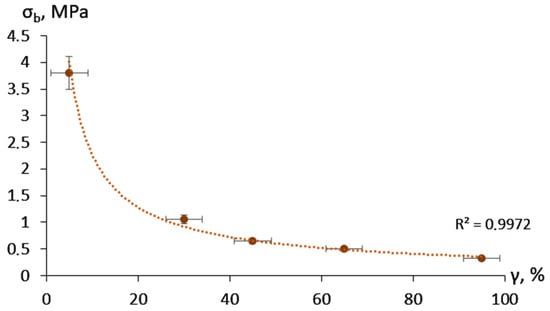 The adhesion strength showed an exponential decrease with the increase of moisture content (Figure 3). The prevalent mixed nature of the adhesive destruction in the case of the dry material changed to fully cohesive failure above a moisture content of 30 ± 5%.