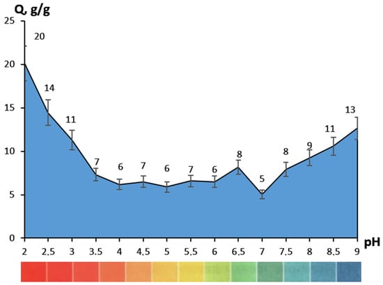 The samples showed accelerated swelling initially (k), with a significant decrease in rate by the end of the study (k2), according to the sorption velocity (Table 1). In addition, the initial sorption period clearly demonstrated a difference in material behavior in different pH media. The shift of medium to more acidic (pH < 6) or alkaline (pH > 7.5) not only increased the sorption rate 2–10 times, but also changed the nature of diffusion (n). The samples ceased to follow Fick’s law (n > 0.5), so polymer mesh relaxation prevailed over diffusion. This may have been an indicator of the ionization of the corresponding groups; on the one hand preferring to become negatively charged –OH, –COOH, and on the other positively charged –NH2.