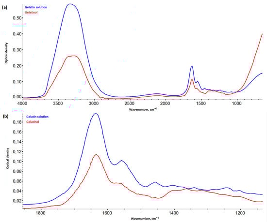 IR spectra of Gelatinol® and 8% gelatin solution: (a) in the range 4000–800 cm−1; (b) in the range 1900–1100 cm−1.