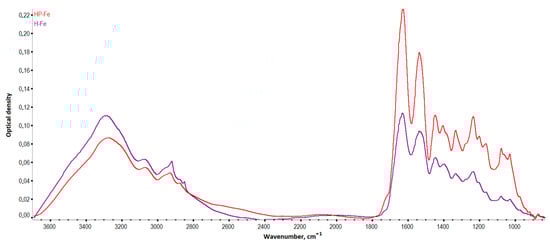 Frequency shifts of the HP-Fe hydrogels peaks associated with –OH oscillations (3284→3274 cm−1) were observed towards smaller wave numbers in comparison with H-Fe. In general, this was an indication of the formation of a more bounded structure with tannin by the hydrogen bonds []. The peaks associated with deformation aromatic C-H (3073→3068 cm−1) and amide I (1633→1628 cm−1) were also displaced. The vibrations of the carbon bonds of the aliphatic structure CH3- (2922→2933 cm−1) and aromatic CH-OH (1402→1405 cm−1) shifted to a longer wavelength region. This also confirmed the proposed scheme of the formation of tannin bonds with other molecules. While the shift of the peak of amide I probably indicated the contribution of succinic acid residues to the fluctuations of the secondary amines associated with carbonyl groups.