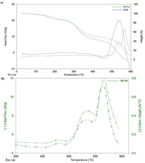 Thermal curves: (a) comparison of the thermal behavior of the HP-Fe and H-Fe hydrogels; (b) first heat and mass derivatives for HP-Fe hydrogels.