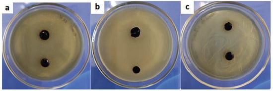 The state of the hydrogel 72 h after the antibacterial test with (a) Escherichia coli, (b) Staphylococcus aureus, and (c) Candida albicans.