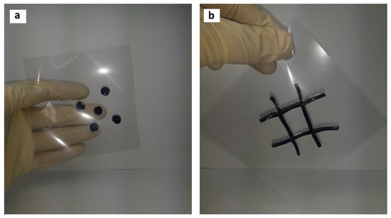 First, 0.75 g tannin was added to 6.84 g hydrogen peroxide (3% mass.), and the pH was regulated to 10 (2M NaOH). The solution was blended and heated at 80 °C for one hour, followed by addition of 0.25 g ferric chloride. Then, 100 g of Gelatinol® was added and mixed for 10 min at 70 °C. Next, the homogeneous solution was poured into petri dishes (Ø35 mm) or silicone molds. After pouring into molds and gelation (gelation characterization with DSC could be found in Supplementary Materials), the hydrogels were easily transferrable to a polyamide substrate, without violating the geometry of the material (Figure 9). Photos of the surface can be found in the Supplementary Materials.