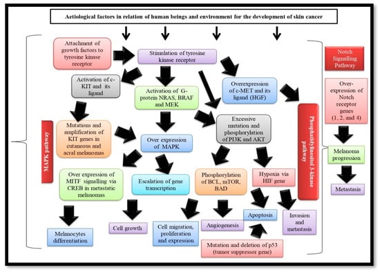 PI3K-AKT, an important cell signaling cascade, can be physiologically triggered in carcinomas by either genetic alteration of PIK3CA and Protein kinase B (AKT1) or cognitive debilitation of phosphatase and tensin homolog deleted on chromosome 10 (PTEN). Tyrosine kinase receptor activation or RAS can either directly or indirectly activate phosphatidylinositol 3-kinase-lipid kinases (PI3 kinases), leading to the conversion of PIP2 to PIP3, which in turn phosphorylates AKT [,]. By changing PIP3 back to PIP2, PTEN lipid phosphatase plays a key antagonist in this pathway. Multi-factor proteins that control cellular activities (proliferation, viability, migration, revascularization, and metabolism) are phosphorylated as a result of AKT (serine/threonine protein kinase) phosphorylation. One of these proteins, called mTOR, has been discovered to be initiated in 73% of human melanoma cell lines and only extremely infrequently in neurons. Many melanomas have increased PI3K signaling, which is typically brought on by mutations, abolition, and stimulation of methylation of the PTEN inhibitor’s coding genes. Tyrosine kinase receptor c-KIT and stem cell factor (ligand of c-KIT) are critical for melanocyte maturation resulting in the deficiency of pigmentation and playing a role in the PI3K-AKT pathway [,]. Several immuno-histochemical research suggested the declination of c-KIT expression along with the progress of melanoma from a primary to a metastatic condition in acral melanomas and cutaneous melanomas in hands, feet, and nail beds (chronic sun-exposed areas) []. Tumor development is also associated with the amplification of the tyrosine kinase receptor c-MET along with its ligand HGF (hepatocytes growth factor), as numerous biological processes, including reproduction, viability, mobility, and penetration, are controlled by c-MET. Studies reported that over-secretion of HGF by melanoma cells or its micro-environment may cause the over-expression of c-MET, resulting in the formation of malignancies and metastasis via activating the PI3K-AKT pathway [,]. The main tumor suppressor gene, p53, is connected to apoptosis and responsible for a number of stressors, including DNA damage, genomic instability, hypoxia, and oncogenic aberrations. More than 50% of carcinomas have p53 mutations, including only 1–5% of original melanomas and 11–25% of metastatic melanomas; however, p53 is frequently lacking in nevi [,,]. Hypoxia, a micro-environment of human skin, becomes a critical component in tumor genesis and metastasis, as typical hypoxia favors cellular proliferation []. Hypoxia-induced factor (HIF) is mainly responsible for mediating the hypoxia response resulting in the activation of numerous genes related to angiogenesis, invasion, and metastasis and promotion of PI3K pathway developing tumor and transforming melanocyte in the hypoxic human skin microenvironment. Due to inadequate vascularization, tumor hypoxia develops with melanoma growth, which raises HIF and promotes melanogenesis, and melanoma progression, having a detrimental prognostic impact [].