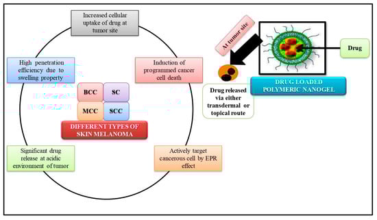 Mechanisms of polymeric nano-gels in the treatment of skin cancer. BCC: Basal cell carcinoma, SCC: Squamous cell carcinoma, SC: Superficial carcinoma, MCC: Merkel cell carcinoma.