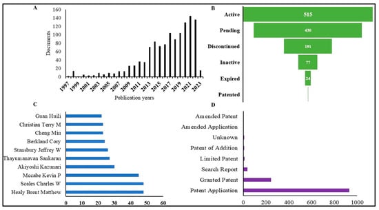Due to its distinctive features, nano-gel is increasingly being recognized as significant material for a variety of applications. Nano-gels can be used in different branches of science like drug delivery, tissue engineering, cosmetics, etc. Patent search with keywords “Nano-gel” and “Nano-gel” + “Skin Cancer” in the title, abstract, and claim showed 1238 and 9 patent results, respectively (Table 2). The patent export data of nano-gel indicate that in recent years the number of patents increasing drastically to more than 100 per year (Figure 4A) with application fields like cellular, ocular, dental, and skin delivery of therapeutics and biologicals. A new class of research includes 3D-printed polymeric nano-gel particles. Out of 1238 patents on nano-gel, around 500 were active, and 400 were pending status (Figure 4B); the United States of America with the highest number of 406 applications, followed by China with 332. Figure 4C lists the major inventor in this field, and Figure 4D shows that to date, 253 patents have been granted and 922 patent applications.