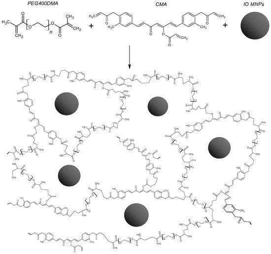 Magnetic nanocomposite microparticle (MNM) gels were prepared through chemically initiated free radical polymerization to obtain PEG-based crosslinked polymers with functional monomers from acrylated plant-derived polyphenols (CMA and QMA) with embedded magnetic iron oxide nanoparticles. The MNM gel systems were characterized as described in previous by from our group []. Briefly, Fourier transform infrared spectroscopy (FTIR) successfully confirmed the incorporation of the polyphenolic groups into the polymeric matrix used to enhance the binding affinity for PCB. The MNM gel systems obtained possessed an approximate 90:10 polymer network to magnetic nanoparticle composition, as determined through thermogravimetric analysis (TGA), which proved to be sufficient to maintain the magnetic properties of the microcomposite in order to use magnetic decantation as a separation technique after their application as sorbents []. Dynamic light scattering was used to determine the average hydrodynamic particle size for the MNM gels in a DI water solution, which ranged from 15 µm to 20 µm []. A schematic representation of the crosslinked polymer matrix interaction with the iron oxide magnetic nanoparticles within the MNM gels is depicted in Figure 1.