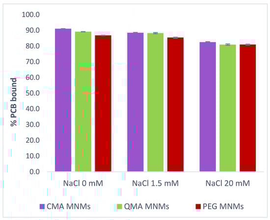 The ionic strength of the solution is an important factor to study given the effect it can have on both the sorbent and the sorbate. In environmental water bodies, different ions will be present, of which sodium tends to be the most common. These ions can interact with the surface of the sorbate through electrostatic interactions and, potentially, weaken the sorption capacity of the sorbent material []. The effect of ionic strength on the sorption capacity of the MNM gel systems using sodium chloride as the model electrolyte is shown in Figure 2. The ionic strengths studied represent salinity levels of freshwater, surface water, and ground water (0, 1.5, and 20 mM, respectively) []. The general trend observed indicates that the effect of increasing the NaCl concentration does not appear to affect the binding capacity of the MNM gels. However, upon closer examination, when the ionic strength increases from 1.5 mM to 20 mM, there is a slight decrease in the binding capacity for all three MNM gel systems from 88% (CMA MNMs and QMA MNMs) and 86% (PEG MNMs) to ~82% and 81%, respectively. Similar behavior has been observed for PCB 126 adsorption to silicone rubber sorbent, wherein the sorption properties of the polymer decreased with increasing ionic strength of solution [,,,,]. A different study conducted by Zhang et al. [] demonstrated that the effect of sodium chloride salt in the range of 0 to 20 g/L3 had a minor effect on the PCB extraction of a phenyl functionalized fiber employed for solid-phase microextraction. Perez et al. [] also observed an insignificant effect of sodium chloride concentration on the adsorption efficiency for PCBs of magnetic iron oxide nanoparticles. The overall decrease in PCB 126 binding of the MNM gel systems in this study is less than 4%, which correlates with what has been seen in the literature, and therefore it is possible to indicate that the ionic strength has a negligible effect on the sorption capacity of the developed MNM gels in the range studied.