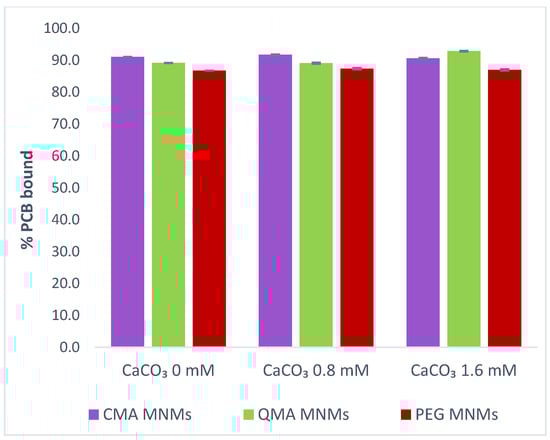 Effect of water hardness on the sorption efficiency of PCB 126 on CMA MNMs, QMA MNMs, and PEG MNMs. The water hardness concentrations represent soft (0 mM), moderately hard (0.8 mM), and hard (1.6 mM) waters.