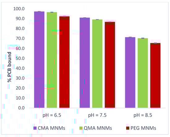 On the other hand, to adjust the pH to 8.5, a glycine sodium hydroxide buffer was used. Under these conditions, it was seen that as the pH increased from 7.5 to 8.5, the amount of PCB bound decreased from 91 to 71% for the CMA MNMs, 89 to 70% for the QMA MNMs, and 86 to 65% for the PEG MNMs. Here, the average decrease in capacity for all the MNM gels was almost 20%. This significant decrease in binding capacity correlates to the general effect of ionic strength observed for the MNM gel systems. This drastic decrease in PCB binding in alkaline solutions has also been reported by Lv et al. [] for biomass-derived porous materials employed in water.