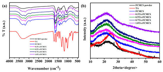 To prepare the multifunctional hydrogels, 2 wt% FCMCS solution was prepared in DDW. A total of 12.5 mL of FCMCS solution was mixed with 2.0 g of AM and stirred until it reached a homogeneous solution. Next, we sequentially added BIS (5 mg), APS (50 mg), and TEMED (10 µL) to the reaction system and filled molds. After 30 min, the hydrogels were formed; then, they were immersed in water to remove unreacted monomers, crosslinker, and initiator. Finally, the resulting FCMCS hydrogels were separately soaked in 50 mL of TA solution (0.3, 0.5, 0.7, and 1.0 wt% prepared and maintained at pH 1.2 via adding 0.1 M HCl solution) at 60 °C for 12 h. Finally, the hydrogels were removed, repeatedly washed with DDW, and freeze-dried for further analysis. The hydrogel formulations were prepared with respect to varying TA concentrations, namely, 0, 0.3, 0.5, 0.7, and 1.0 wt%, and labeled FCMCS, 0.3TA-FCMCS, 0.5TA-FCMCS, 0.7TAFCMCS, and 1.0TAFCMCS, respectively.