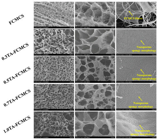SEM images are a valuable tool for analyzing the structures and properties of hydrogel materials. Figure 2 shows SEM images of the TA-FCMCS hydrogels with varying amounts of TA. The resulting images reveal that the lyophilized FCMCS hydrogel exhibited a three-dimensional network structure with interconnected regular pores and FCMCS fiber structures with smooth surfaces [13]. In contrast, the lyophilized TA-FCMCS hydrogel had a similar porous structure with a nanofibrous surface topology. It is worth noting that the fibrous structure of FCMCS was destroyed in the TA-FCMCS hydrogel due to the formation of hydrogen-bonding interactions between TA and FCMCS during the soaking of the hydrogel in the TA solutions. Interestingly, a nanofibrous surface topology was observed for all the TA-FCMCS hydrogel samples, with the nanofibrous topology becoming more apparent with increasing amounts of TA due to the hydrogen-bonding interactions between TA and FCMCS [20]. The appearance of clear pores and a nanofibrous surface topology is beneficial for retaining wound moisture for longer periods and removing wound extrudate after the removal of the dressing at the wound site [25]. Furthermore, these structures would be beneficial for cell growth for new ECM modeling.