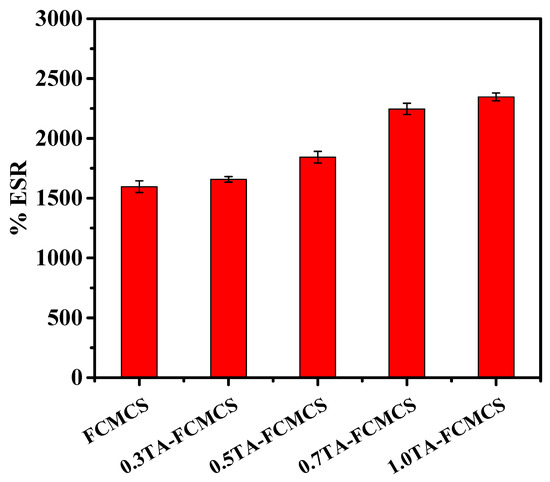 Figure 3 displays the equilibrium-swelling properties of the FCMCS and TA-FCMCS hydrogels. The FCMCS hydrogel exhibited good swelling capacity (1595.92 ± 48.54%) under physiological conditions (pH 7.4). In comparison to the FCMCS hydrogel, 1.0TA-FCMCS had the highest swelling capacity (2346.32 ± 32.65%) under similar conditions, which could be attributed to the presence of TA in the hydrogel. The %ESR increased significantly with an increase in the TA content in the hydrogel networks. The greater water retention in the TA-FCMCS hydrogel’s architecture is due to the presence of hydrophilic groups of hydroxyl-rich TA and hydrophilic groups of FCMCS and PAM networks (–OH, –CO-NH2, and –COOH). Therefore, this hydrogel is suitable for wound-dressing applications.