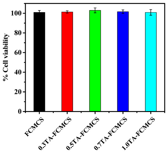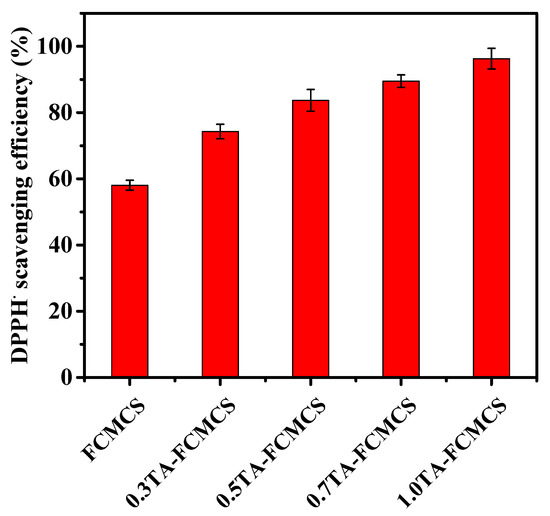 In general, CMCS shows good antioxidant properties due to the availability of carboxymethyl groups on its structure. In this study, the FCMCS hydrogel also shows good antioxidant properties because of the existence of the FCMCS polymer in the hydrogel system. FCMCS can act as an electron donor, which can help to neutralize free radicals and prevent oxidative damage. Additionally, CMCS has been found to increase the activity of antioxidant enzymes such as superoxide dismutase (SOD) and catalase, which can further protect cells from oxidative stress [31]. Furthermore, the incorporation of TA into the FCMCS hydrogel enhanced its antioxidant properties. To determine free-radical-scavenging activity, we used DPPH as a radical and found that the incorporation of TA into the FCMCS hydrogels significantly improved the radical-scavenging activity of the final product (Figure 7). Additionally, the clearance ratio of the radical of the TA-FCMCS hydrogels increased with the increase in TA content. The abundant hydroxyl groups in TA, which include catechol and pyrogallol, contribute to the high radical-scavenging activity of the TA-FCMCS hydrogels (96.2% for 1.0TA-FCMCS). Previous studies have reported that the antioxidant activity of polyphenols is associated with the hydroxyl groups in their structures [32]. Therefore, the radical-scavenging activity of the TA-FCMCS hydrogels is mainly attributed to the abundant hydroxyl groups in TA.