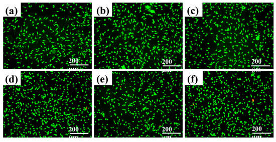 Live/dead images of skin fibroblasts cultured on (a) control, (b) FCMCS, (c) 0.3TA-FCMCS, (d) 0.5TA-FCMCS, (e) 0.7TA-FCMCS, and (f) 1.0TA-FCMCS hydrogels after 72 h of incubation.