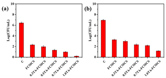 TA has been shown to exhibit antibacterial activity against both Gram-positive and Gram-negative bacteria. Some studies have found that TA is more effective against Gram-positive bacteria, while others have found it to be more effective against Gram-negative bacteria. However, the exact effectiveness of TA against specific bacterial strains can vary depending on factors such as concentration, exposure time, and the method of testing. Recent studies have proven that FCMCS exhibits good antibacterial activity [27,28,29,30]. Thus, the antibacterial activities of the FCMCS and TA-FCMCS hydrogels were evaluated using the CFU method. Figure 6 illustrates that the growth inhibition values of the FCMCS hydrogels toward Escherichia coli and Staphylococcus aureus were about 65% and 52%, respectively, indicating that even FCMCS alone possesses an antibacterial effect. The antibacterial rates of the TA-FCMCS hydrogels against Escherichia coli (96%) and Staphylococcus aureus (89%) were significantly higher than those of FCMCS. Moreover, increasing the amount of TA improved the antibacterial properties of the TA-FCMCS hydrogels, indicating that the observed antibacterial performance was mainly due to both FCMCS and TA. Our findings suggest that the addition of TA to hydrogels can enhance their capacity to kill Gram-positive and Gram-negative bacteria [27,28,29,30]. The viability of the bacteria (Escherichia coli and Staphylococcus aureus) exposed to TA-FCMCS hydrogel was substantially reduced compared to that of the FCMCS hydrogel, indicating the critical role of TA in improving bactericidal properties. TA has been shown to have different mechanisms of action against these different types of bacteria. Gram-positive bacteria have a thick peptidoglycan layer in their cell walls, while Gram-negative bacteria have a thinner peptidoglycan layer and an outer membrane composed of lipopolysaccharides (LPSs). In Gram-positive bacteria, TA can disrupt the cell wall, leading to lysis and cell death. In Gram-negative bacteria, TA can disrupt the outer membrane and cause leakage of the intracellular contents, leading to bacterial death [27,28,29,30]. Overall, the incorporation of TA and FCMCS in the hydrogels is a promising approach for wound dressing, potentially improving wound-healing outcomes and reducing the risk of infection and inflammation. However, further research is needed to optimize the formulation and assess the safety and efficacy of these hydrogels in clinical settings.