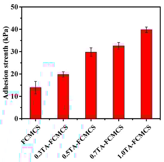 As wound repair materials, the ability to adhere to tissues is a crucial characteristic of hydrogels, and various hydrogel adhesives designed for wound closure have been documented [33]. To evaluate the tissue adhesion ability of the TA-FCMCS hydrogels, tensile tests were performed on porcine skin, which functioned as a model tissue (Figure 8). The FCMCS hydrogel exhibited an average adhesive strength of 13.9 ± 2.8 kPa. In contrast, the amount of TA incorporated into the FCMCS hydrogels was significantly higher than that of the FCMCS hydrogels. The adhesion strength values of the 0.3TA-FCMCS, 0.5TA-FCMCS, 0.7TA-FCMCS, and 1.0TA-FCMCS hydrogels were 19.8 ± 1.2, 29.8 ± 1.9, 32.6 ± 1.5, and 39.8 ± 1.2 kPa respectively. The results confirmed that the adhesion strength of the TA-FCMCS hydrogel significantly improved when increasing the concentration of TA. This improvement could be attributed to the increased presence of phenol groups in the hydrogel network, which facilitated dynamic Schiff-base-binding reactions with amino groups in the skin tissue, thus enhancing interfacial adhesion. These findings suggest that the TA-FCMCS hydrogels exhibit diverse interfacial adhesion properties, indicating their potential for use as reliable medical adhesives for wound dressing.