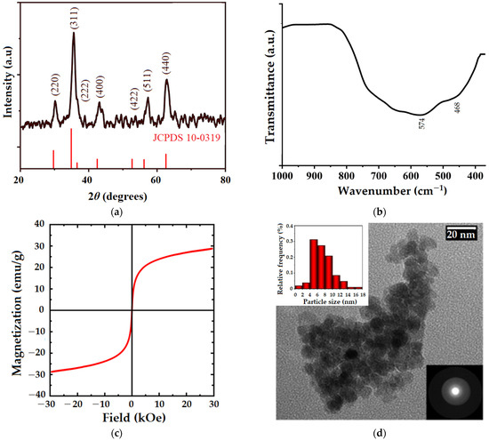 X-ray diffraction (XRD), Fourier-transform infrared spectroscopy (FTIR), vibrating-sample magnetometer (VSM), and transmission electron microscopy (TEM) were used to characterize the manganese ferrite (MnFe2O4) obtained by the sol-gel auto-combustion technique, as shown in Figure 2. According to the XRD pattern in Figure 2a, the MnFe2O4 sample is characterized by a crystalline structure. Peaks observed at 30.25°, 35.64°, 36.90°, 43.02°, 53.7°, 57.2°, and 62.85° confirm the pure cubic spinel structure of manganese ferrite (according to JCPDS card no. 10-0319) and correspond to the (220), (311), (222), (400), (422), (511), and (440) diffraction planes, respectively [35,36]. Figure 2b shows the FTIR spectra of MnFe2O4 registered in the range of 1000–400 cm−1, which is in close agreement with the XRD findings about the spinel structure of the analyzed sample. Therefore, the band observed at 574 cm−1 is attributed to the vibration of the metal-oxigen bond in the tetrahedral sites of the spinel matrix, and the band at 468 cm−1 corresponds to the vibration of the metal-oxigen bond in the octahedral positions [35]. VSM was used to evaluate the magnetic properties of manganese ferrite nanoparticles at room temperature (Figure 2c). Considering the fact that the magnetization loop has no hysteresis, the obtained ferrite can be classified as superparamagnetic, with a magnetization value of 28.77 emu/g. This is also supported by coercivity and remanence values that are almost zero, indicating that the magnetization practically disappears with the removal of the external magnetic field. Similar behavior was also observed when manganese ferrite was synthesized by the co-precipitation technique [35]. The morphological features of MnFe2O4 nanoparticles were assessed by TEM, as highlighted in Figure 2d. Thus, the almost spherical-shaped nanoparticles can be observed, with a high tendency to agglomerate due to their magnetic properties. Based on the TEM image, particle size distribution was determined using Image J software (version 1.45s, National Institute of Health, Bethesda, MI, USA). According to the inset histogram (Figure 2d, upper left corner), the MnFe2O4 nanoparticles were found to be smaller than 18 nm in size. The selected electron diffraction pattern (Figure 2d, lower right corner) shows individualized, blurry rings, suggesting once again the crystallinity of the sample, as it is also shown in the XRD pattern.