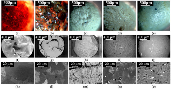 For an in-depth analysis of the morphological modifications of the beads, SEM microscopy was used (Figure 3f–j). It can be noticed that the images obtained by SEM are consistent with their analogues provided by polarized light microscopy (Figure 3a–e). Despite the cross-sectional morphology obtained by the freeze-drying process (large, elongated pores), the CMC and CMC-Mn beads present a non-porous and brittle surface morphology as a result of cross-linking with iron cations (Figure 3f,g,k,l).