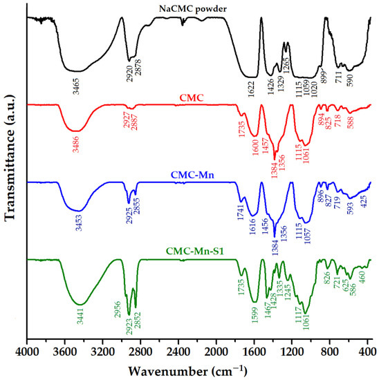 FTIR spectra of carboxymethyl cellulose powder (raw CMC powder) and of the investigated beads (CMC, CMC-Mn, and CMC-Mn-S1).
